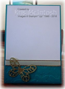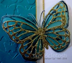 I flipped the image over and used the Bermuda Bay Stampin’ Blends to colour in the butterfly. I cut out the butterfly and attached it to the card front using glue dots (in the centre only). I cut out the medium detailed butterfly from Gold Glimmer Paper using the Butterflies Thinlits Dies.