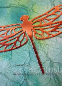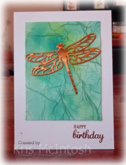 The panel is attached to scored and folded thick Whisper White A4 card . I stamped the greeting from the Best Birds stamp set onto the bottom right hand corner using Versamark ink, sprinkled it with Copper Embossing Powder and heat set using my heat tool. I cut the dragonfly from Copper Foil card using the Detail Dragonfly Thinlits Dies and attached it over the tissue paper.