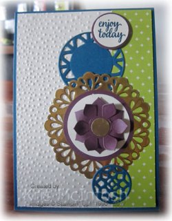 I cut Dapper Denim card using a small circle die from the Eastern Medallions Thinlits Dies and also a medium circle from the same dies. These are attached to the card front, small one below and the large one above the Gold Doily. I stamped “enjoy today” from the Eastern Beauty stamp set onto Very Vanilla card using Dapper Denim ink and attached it to a circle of Berry Burst card cut using the smallest Layering Circles Die. The greeting is attached to the card front using dimensionals. I cut the flower from Berry Burst card twice and then cut between the petals to make two flowers.