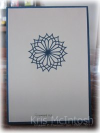To decorate the inside of the card, I borrowed an idea shared on a demonstrator facebook group. Unfortunately I have forgotten the demonstrator’s name but I am really thankful for the idea. You simply stamp the flower and then stamp twice more, slightly offsetting each time. I creates this gorgeous flower medallion. My flower is stamped in Dapper Denim ink onto Very Vanilla card.