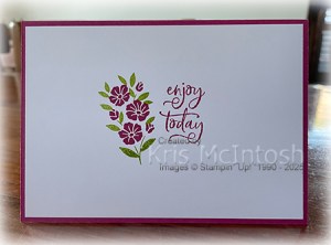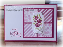 I stamped the greeting from the Labeled with Love stamp set beside the Designer Series Paper panel using Berry Burst ink. The whole panel is attached to scored and folded Berry Burst card. I stamped the floral image from the Labeled with Love stamp set onto Basic White card using Berry Burst ink. I stamped the leaf image around the flowers using Granny Apple Green ink. The floral image is cut out using the Labeled with Love Die before being attached to the centre of the Designer Series Paper panel using dimensionals.
