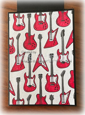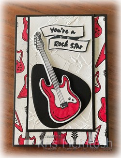 I cut Basic Black card using the large guitar pick die from the Rock Star Dies and attached it to the bottom of the embossed card. I stamped the guitar image from the Rock Star stamp set onto Basic White card using Memento Tuxedo Black ink. I coloured the image using the Dark Real Red Stampin’ Blend before cutting it out using the co-ordinating Rock Star Die. I attached the guitar to the card front using dimensionals. I stamped the greeting from the Rock Star stamp set onto Basic White card using Memento Tuxedo Black ink.
