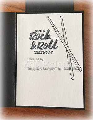 I cut out the image using the co-ordinating Rock Star Die and attached it to the card front. To decorate the inside of the card I stamped the greeting from the Rock Star stamp set onto Basic White card using Memento Tuxedo Black ink. I stamped a drum stick image next of the greeting using Memento Tuxedo Black ink. I masked the stamped image and stamped another drums stick over the first image. I removed the mask and coloured the drum sticks using a Light Gray Granite Stampin’ Blend. This is such a fun card to create and a great way to use up some of your Designer Series Paper. So thank you Mary for the inspiration to create.