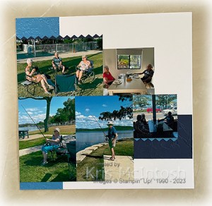 I also embossed Night of Navy card using the Painted Texture 3D Embossing Folder and attached a piece across the lower part of each page. I die cut Night of Navy card and Azure Afternoon card using one of the Basic Border Dies and attached the pieces to the back of several of the photos before attaching them to the pages. I cut the title from Night of Navy card using the Alphabet A La Mode Dies and attached it to the upper left hand corner of the first page. I stamped the greeting from the Something Fancy stamp set onto Basic White card using Night of Navy ink. I punched out the greeting using the 1-3/4″ Circle Punch before attaching it to the left hand page. I printed the journaling onto Basic White card and it is also attached to the left hand page.