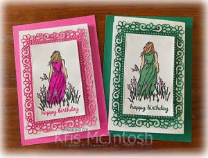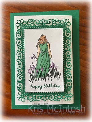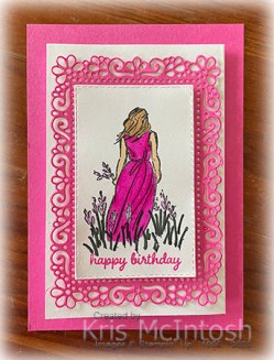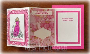 I cut it out using one of the Stitched Rectangle Dies. I coloured the image using Magenta Madness, Light Medium (light) Skin tones, Medium (dark) Skin Tones, Dark Fresh Freesia and Dark Evening Evergreen Stampin’ Blends. I stamped the “happy birthday” from the Timeless Tulips stamp set onto the bottom of the image panel using Magenta Madness ink.
