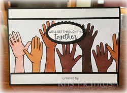 Today’s card once more uses some of the product from the All Together Collection. For this card, I attached a piece of the All Together 6″ x 6″ Designer Series Paper to scored and folded Bermuda Bay card. I stamped the image from the Here Together stamp set onto Basic White card using Memento Tuxedo Black ink. I coloured one hand using the Medium Skin Tone Stampin’ Blends and the other using the Medium Light Skin Tone Stampin’ Blends.