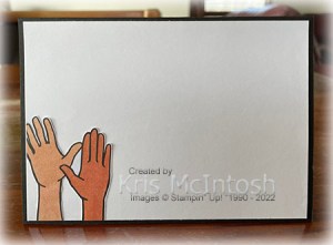 I stamped the greeting from the Here Together stamp set onto Basic White card using Memento Tuxedo Black ink and punched it out using the Double Oval Punch. The greeting is attached to a scollaped Basic Black oval cut using the same punch, and then the card front. I had actually coloured the whole 6″ square piece of Designer Series Paper, so to decorate the inside of the card, I cut off the two hands on the left hand side of the paper and attached them to the lower left hand corner of Basic White card.