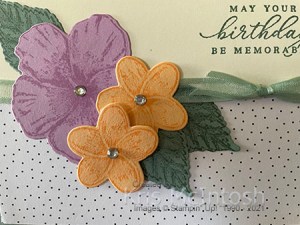 I stamped the large flower from the Merriest Moments stamp set onto Very Vanilla card using Blushing Bride ink and covered it with a post-it-note mask. I stamped the medium leaf image from the Merriest Moments stamp set three times around the flower using Soft Sea Foam ink. I stamped the small flower from the Merriest Moments stamp set onto Very Vanilla card using Blushing Bride ink and it out using the co-ordinating Merriest Frames Die. I attached the small flower to the centre of the stamped large flower before attaching the Very Vanilla card to the Soft Sea Foam pop up. I stamped the greeting from the Merriest Moment stamp set onto Very Vanilla card using Blushing Bride ink before stamping the small flower from the same stamp set using the same ink. I masked the small flower and stamped the medium leaf image from the Merriest Moment stamp set three times around the flower using Soft Sea Foam ink. I stamped the small flower onto Very Vanilla card using Blushing Bride ink and cut it out using the co-ordinating Merriest Frames Die. I attached the flower over the stamped flower before attaching the panel to the Soft Sea Foam pop up. I didn’t emboss the Very Vanilla panels on the inside of this card so that I would have somewhere to write my message.