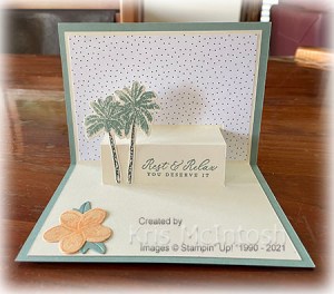 I added three Basic Rhinestones to the centre of each of the flowers to add a little bling just because I can. I cut my pop up from Very Vanilla card and attached it inside the card base. I attached another piece of Pattern Party Designer Series Paper to the top section of the pop up panel. I stamped the greeting onto the pop up panel using Soft Succulent ink. I inked the palm tree image from the Timeless Tropical stamp set using Evening Evergreen and Soft Succulent Stampin’ Write Markers and stamped the image onto Very Vanilla card. The image is cut out using the co-ordinating In The Tropics Die and attached next to the greeting on the pop up panel. I attached a frangipani flower to the lower left hand corner and also some leaves I die cut from Soft Succulent card using the In The Tropics Dies.